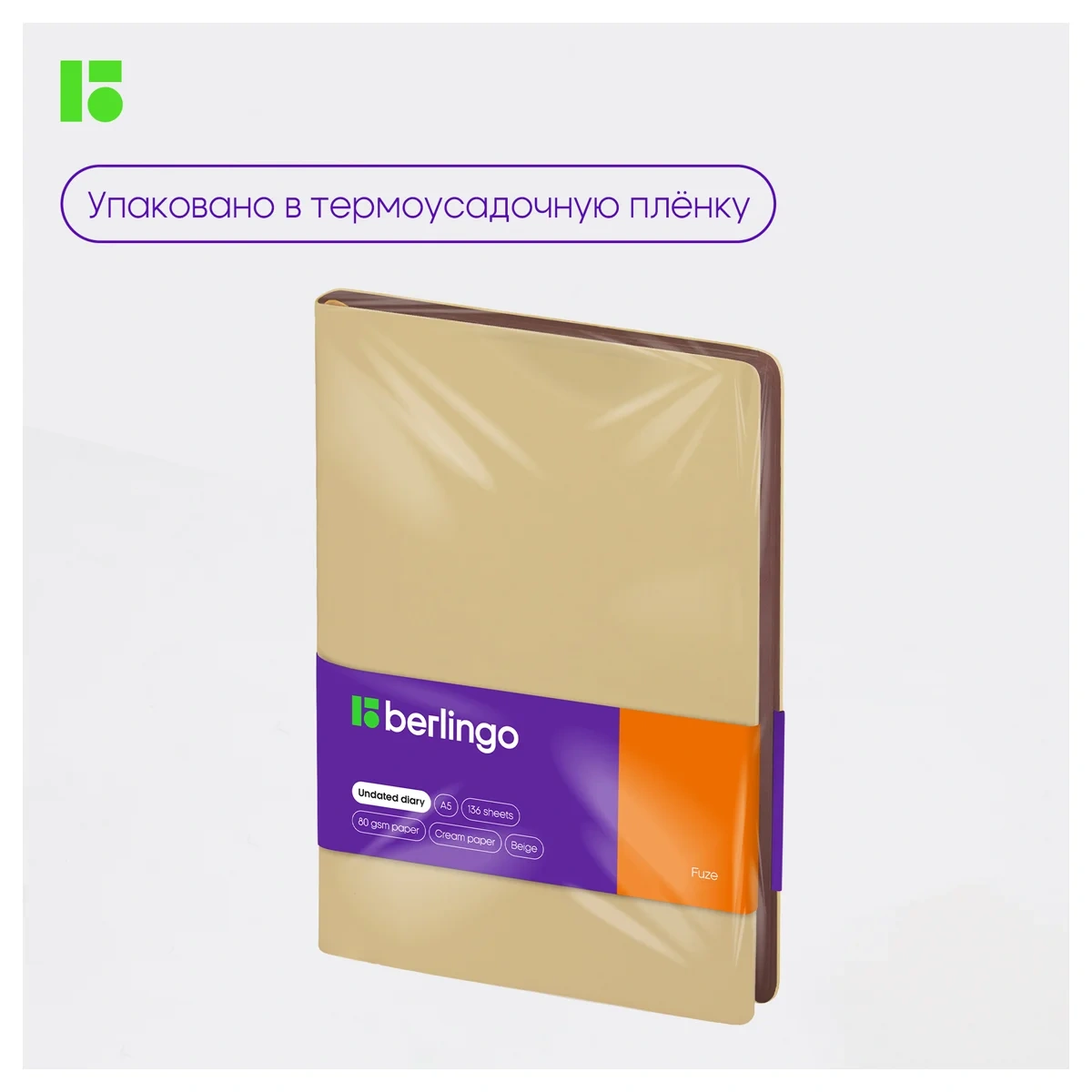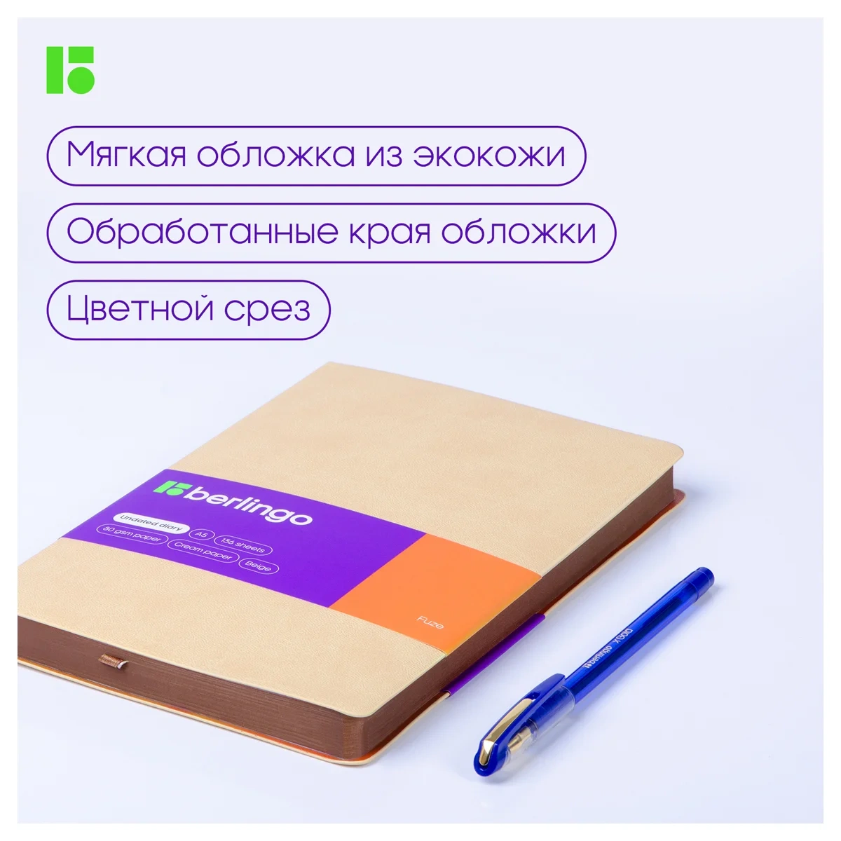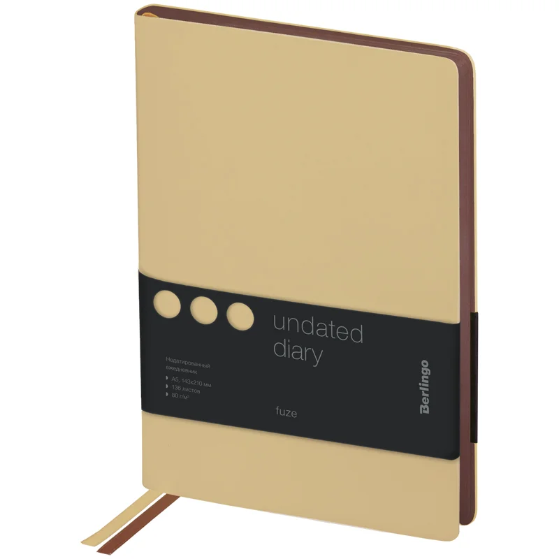 Стильный недатированный ежедневник Berlingo Fuze формата А5 с ультрамягкой обложкой из экокожи. Обложка бежевого цвета ярко контрастирует с коричневым срезом. Внутренний блок состоит из 136 листов высококачественной кремовой бумаги повышенной плотности 80 г/м? с пантонной печатью в 2 краски. Недатированный ежедневник Berlingo Fuze представлен в размере 143 на 210 мм.