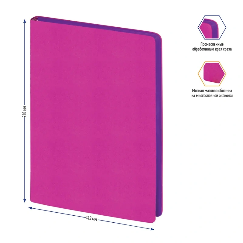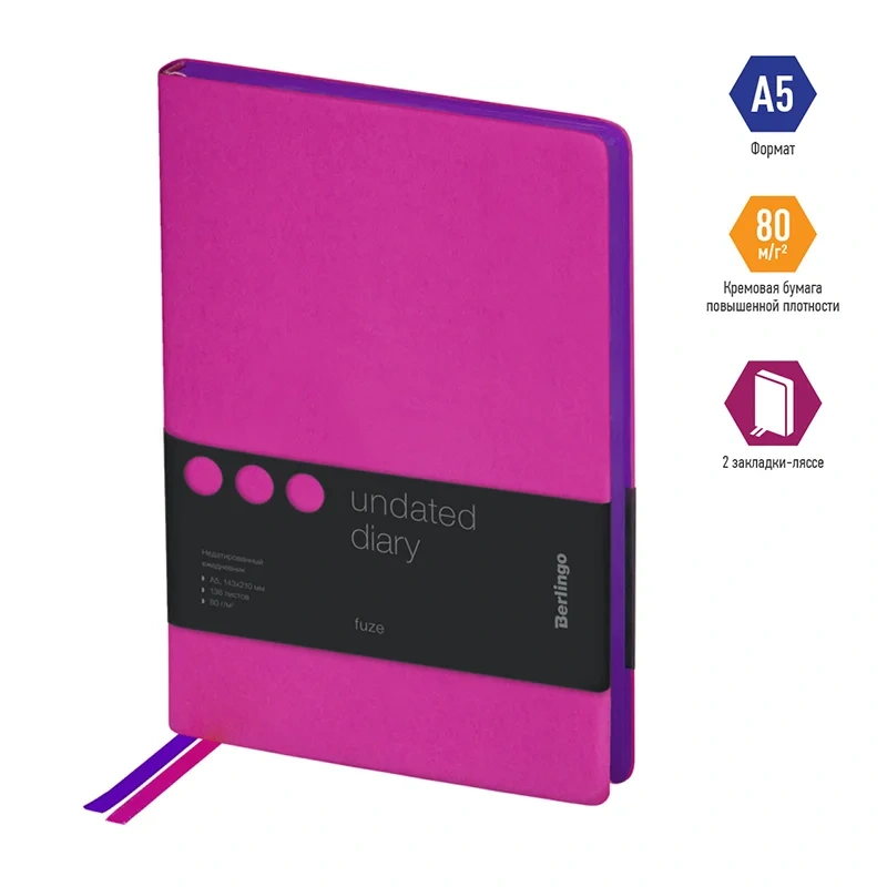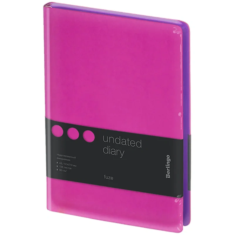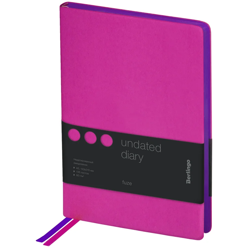 Стильный недатированный ежедневник Berlingo Fuze формата А5 с ультрамягкой обложкой из экокожи. Обложка цвета фуксии ярко контрастирует с фиолетовым срезом. Внутренний блок состоит из 136 листов высококачественной кремовой бумаги повышенной плотности 80 г/м? с пантонной печатью в 2 краски. Недатированный ежедневник Berlingo Fuze представлен в размере 143 на 210 мм.