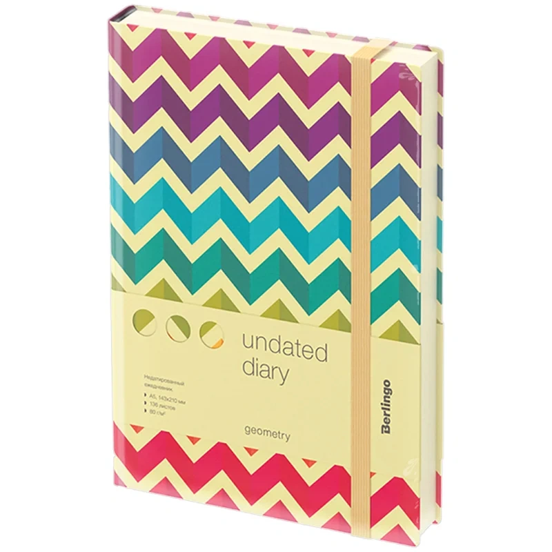 Стильный недатированный ежедневник Berlingo Geometry формата А5 с разноцветной полужесткой обложкой из высококачественной экокожи. Размер 143 на 210 мм. Внутренний блок состоит из 136 листов высококачественной кремовой бумаги повышенной плотности 80 г/м2 с пантонной печатью в 2 краски.