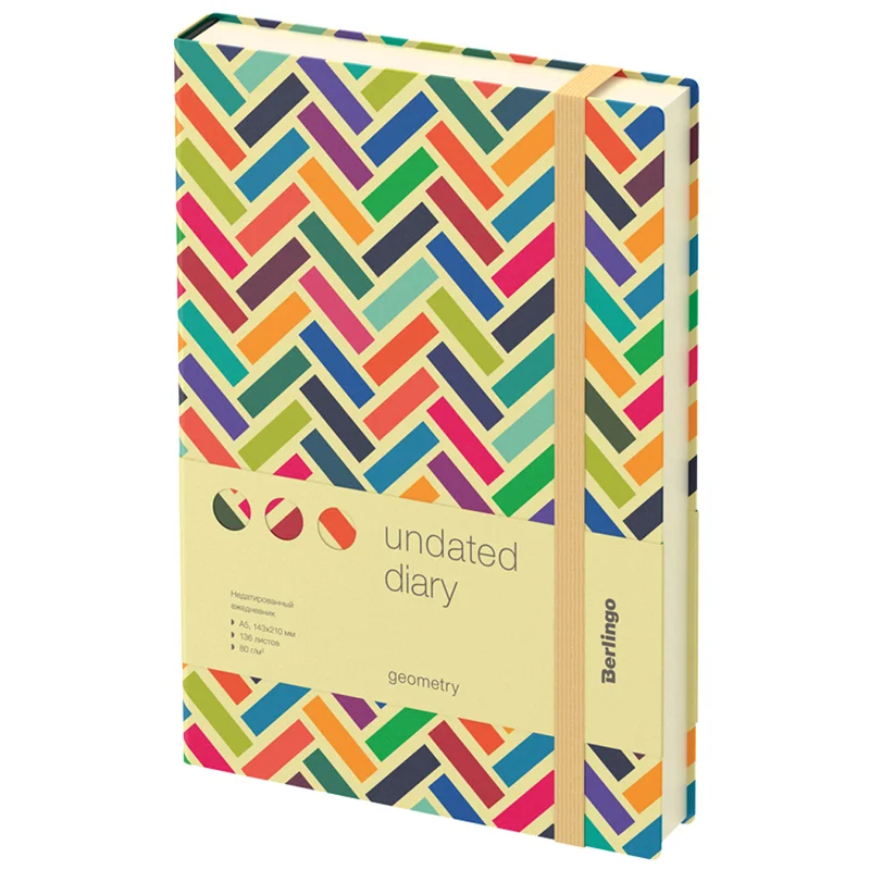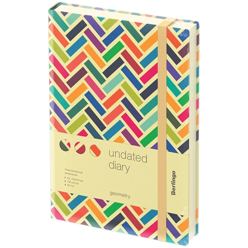 Стильный недатированный ежедневник Berlingo Geometry формата А5 с разноцветной полужёсткой обложкой из высококачественной экокожи. Яркие графические элементы создают необычный геометрический узор на обложке. Внутренний блок состоит из 136 листов высококачественной кремовой бумаги повышенной плотности 80 г/м? с пантонной печатью в 2 краски. Недатированный ежедневник Berlingo Geometry представлен в размере 143 на 210 мм.
