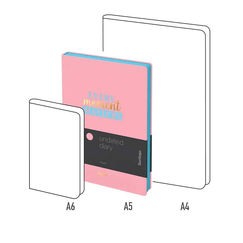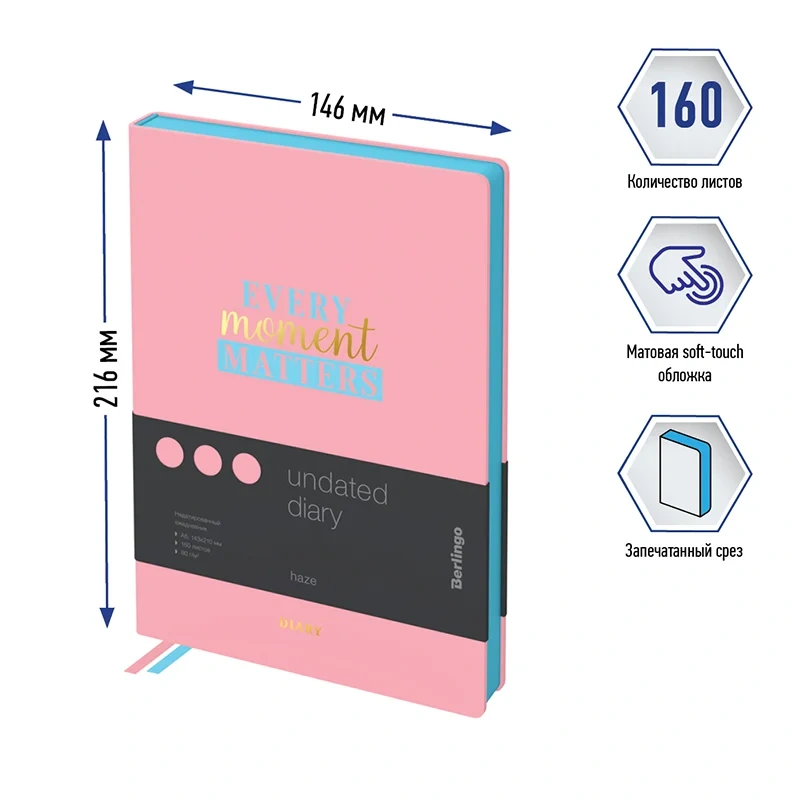 Недатированные ежедневники Berlingo 'Haze' в твердой обложке с поролоновой подкладкой из искусственной кожи розового цвета с дизайном. Софт-тач материал обложки. Голубой срез блока. Внутренний блок из 160 листов высококачественной кремовой бумаги повышенной плотности 80 г/м?, пантонная печать в 2 краски, справочный материал и перфорированные уголки. Две закладки-ляссе. Отрывные заметки, бланки извещения о ДТП и справочные материалы. 3 комплекта стикеров станут приятным подарком. Индивидуальная упаковка. Подходят под персонализацию