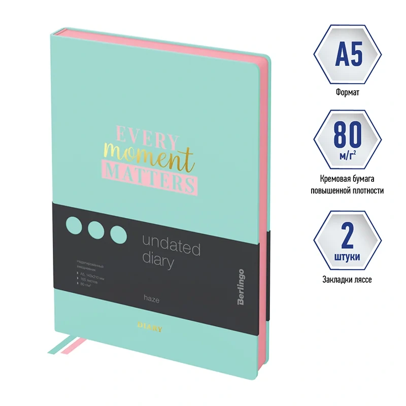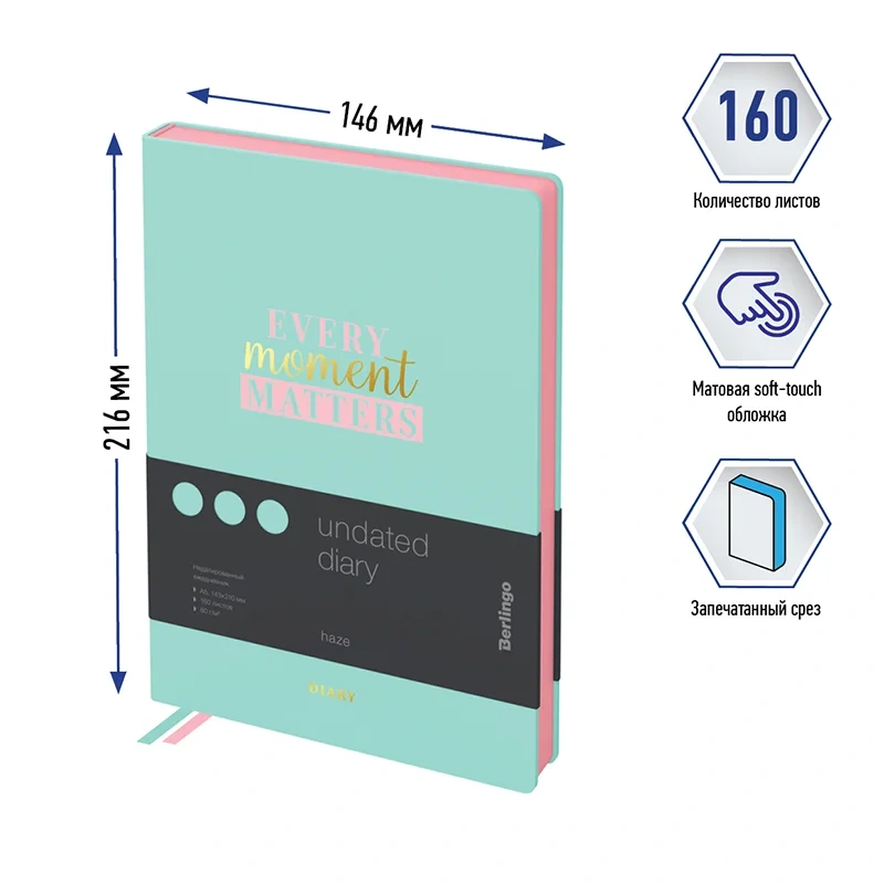 Недатированные ежедневники Berlingo 'Haze' в твердой обложке с поролоновой подкладкой из искусственной кожи мятного цвета с дизайном. Софт-тач материал обложки. Розовый срез блока. Внутренний блок из 160 листов высококачественной кремовой бумаги повышенной плотности 80 г/м?, пантонная печать в 2 краски, справочный материал и перфорированные уголки. Две закладки-ляссе. Отрывные заметки, бланки извещения о ДТП и справочные материалы. 3 комплекта стикеров станут приятным подарком. Индивидуальная упаковка. Подходят под персонализацию