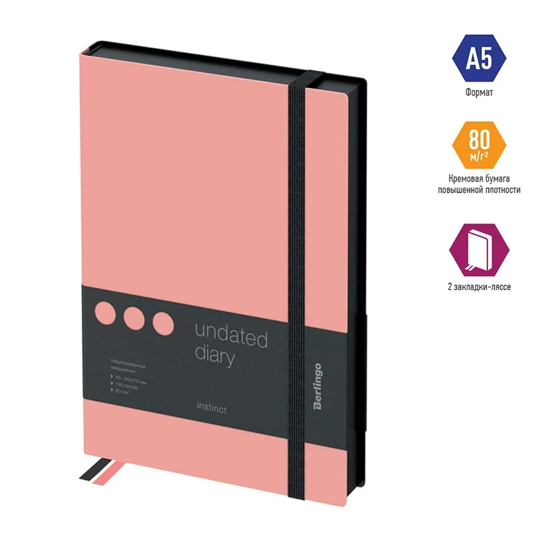 Стильный недатированный ежедневник Berlingo Instinct формата А5 с ярким цветным контрастным срезом и ультрамягкой обложкой из высококачественной экокожи. Нежный цвет обложки фламинго создаёт эффектный контраст с черным цветом среза. Внутренний блок состоит из 136 листов высококачественной кремовой бумаги повышенной плотности 80 г/м? с пантонной печатью в 2 краски. Недатированный ежедневник Berlingo Instinct представлен в размере 143 на 210 мм.