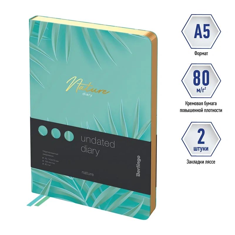 Недатированные ежедневники Berlingo 'Nature' в мягкой обложке из искусственной кожи с дизайном. Золотой срез блока. Внутренний блок из 136 листов высококачественной кремовой бумаги повышенной плотности 80 г/м?, пантонная печать в 2 краски, справочный материал и перфорированные уголки. Две закладки-ляссе. Отрывные заметки, бланки извещения о ДТП и справочные материалы. 3 комплекта стикеров станут приятным подарком. Индивидуальная упаковка. Подходят под персонализацию