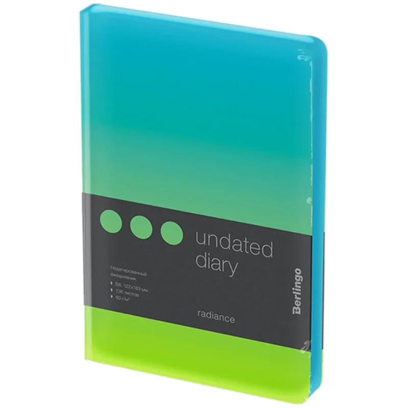 Стильный недатированный ежедневник Berlingo Radiance формата B6 с ярким цветным контрастным срезом и ультрамягкой обложкой из высококачественной экокожи. Насыщенный зелено-голубой градиент стильно сочетается со срезом синего цвета. Внутренний блок состоит из 136 листов высококачественной кремовой бумаги повышенной плотности 80 г/м? с пантонной печатью в 2 краски. Недатированный ежедневник Berlingo Radiance представлен в размере 122 на 183 мм.