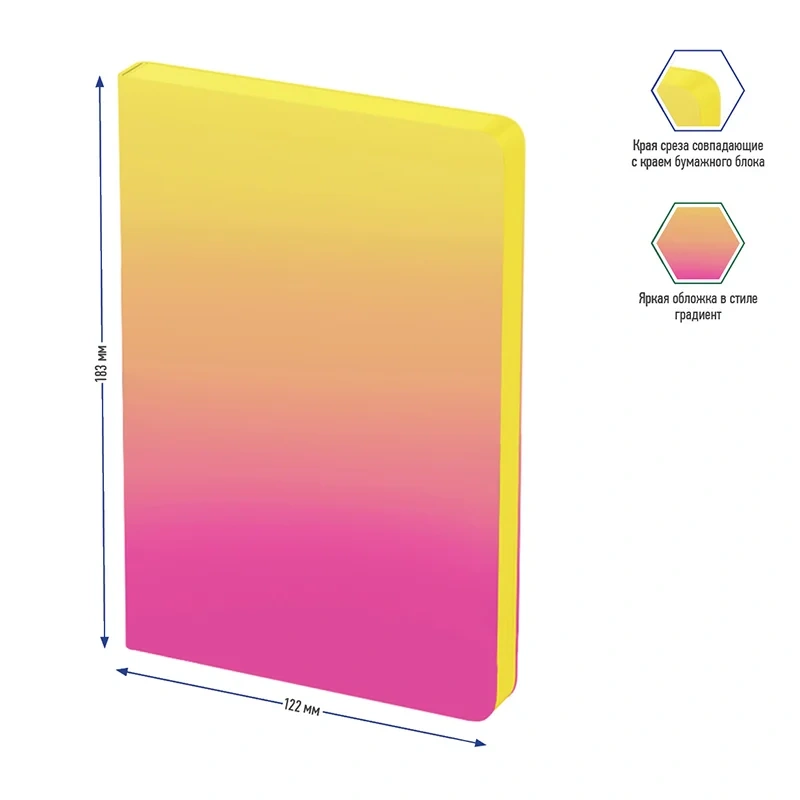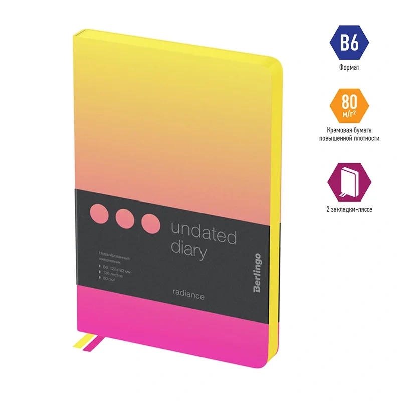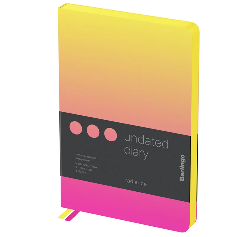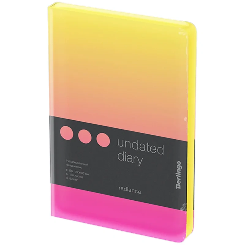Стильный недатированный ежедневник Berlingo Radiance формата B6 с ярким цветным контрастным срезом и ультрамягкой обложкой из высококачественной экокожи. Насыщенный розово-желтый градиент стильно сочетается со срезом желтого цвета. Внутренний блок состоит из 136 листов высококачественной кремовой бумаги повышенной плотности 80 г/м? с пантонной печатью в 2 краски. Недатированный ежедневник Berlingo Radiance представлен в размере 122 на 183 мм.