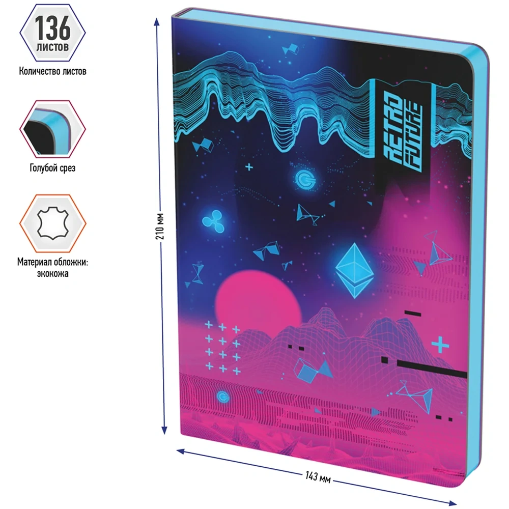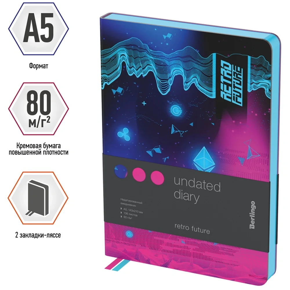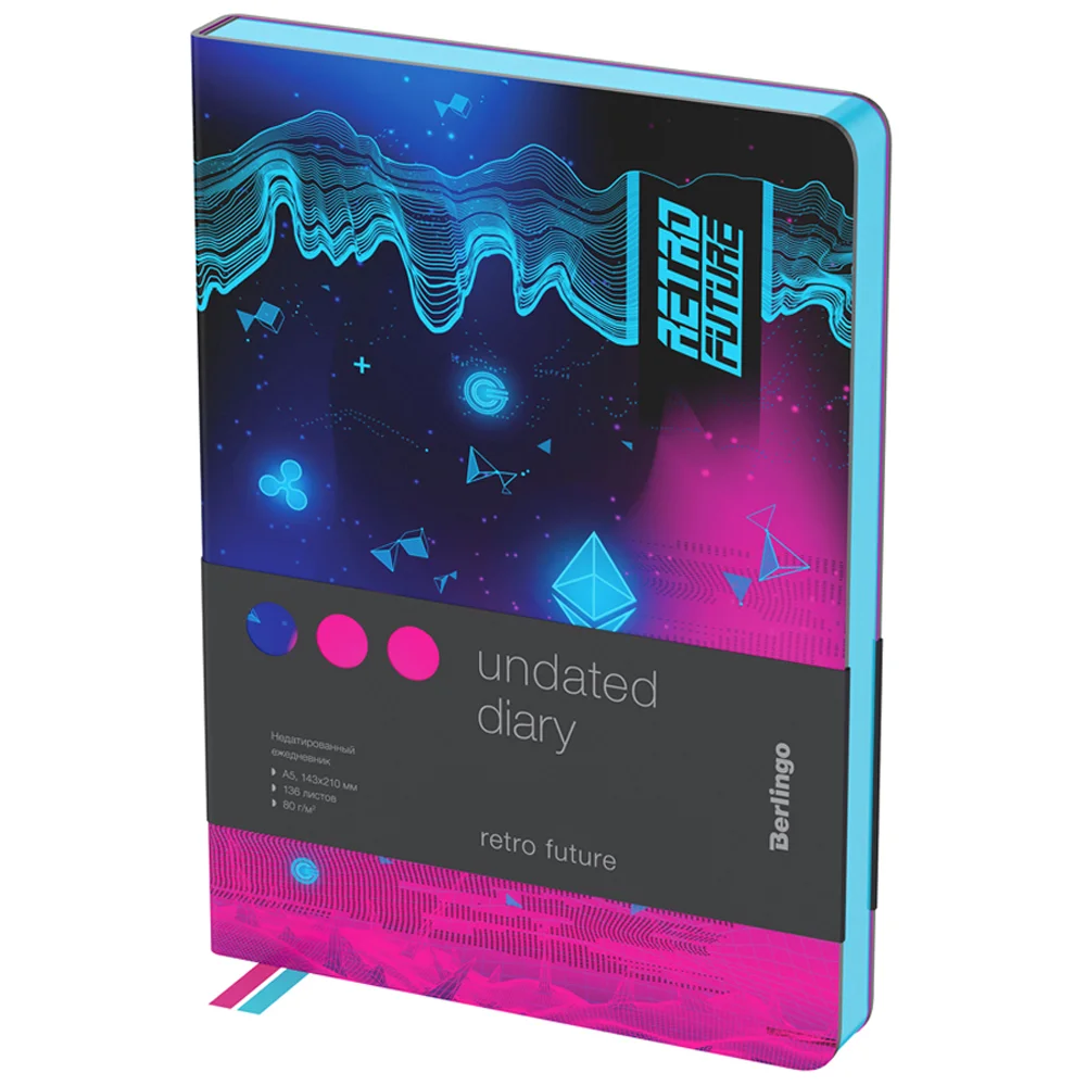 Стильный недатированный ежедневник Berlingo Retro Future формата A5 с ярким цветным контрастным срезом и ультрамягкой обложкой из высококачественной экокожи. Яркий дизайн коллекционной серии Berlingo Retro Future. Внутренний блок состоит из 136 листов высококачественной кремовой бумаги повышенной плотности 80 г/м? с пантонной печатью в 2 краски. Представлен в размере 143 на 210 мм.