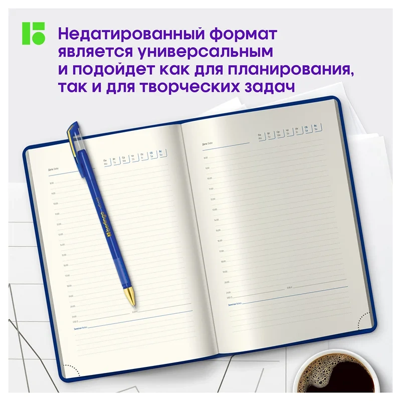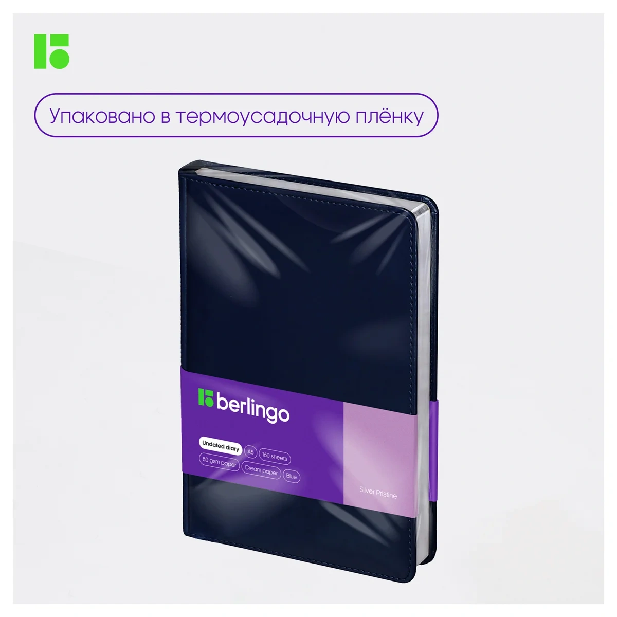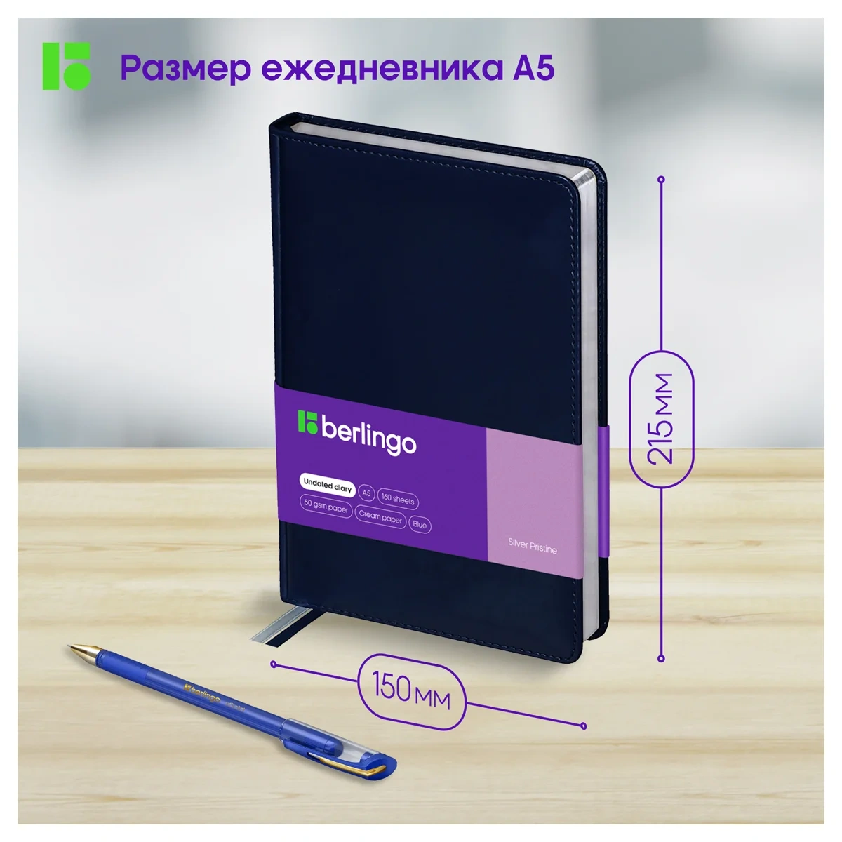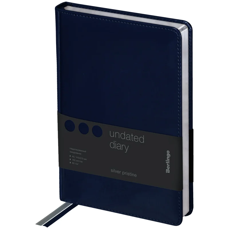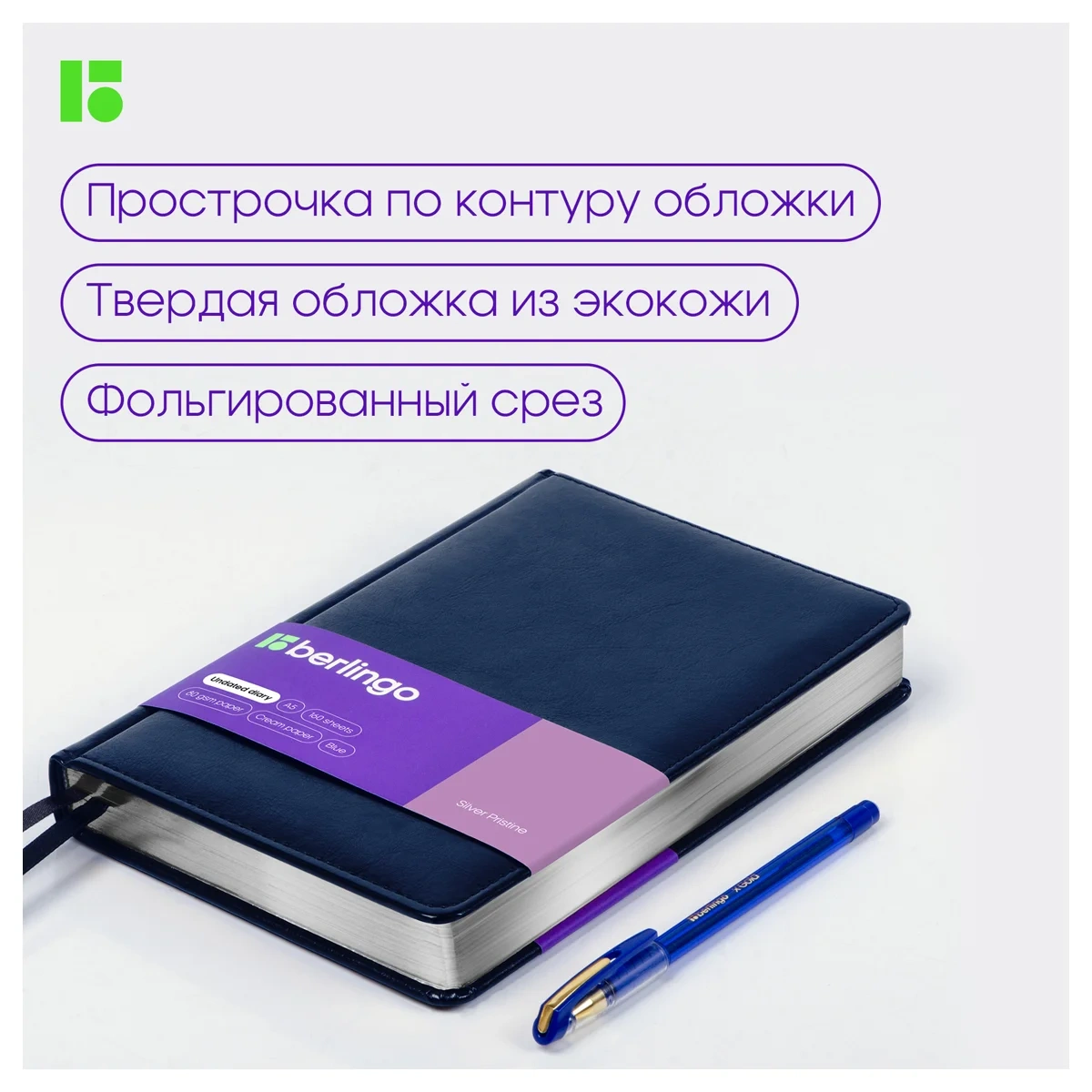 Глянцевый недатированный ежедневник Berlingo Silver Pristine формата А5 с твердой обложкой из экокожи и поролоновой прослойкой идеален для повседневного использования. Сочетание серебряного фольгированного среза и синей обложки делает ежедневник элегантной деталью делового образа. Внутренний блок состоит из 160 листов высококачественной кремовой бумаги повышенной плотности 80 г/м? с пантонной печатью в 2 краски. Размер недатированного ежедневника – 143 на 210 мм.