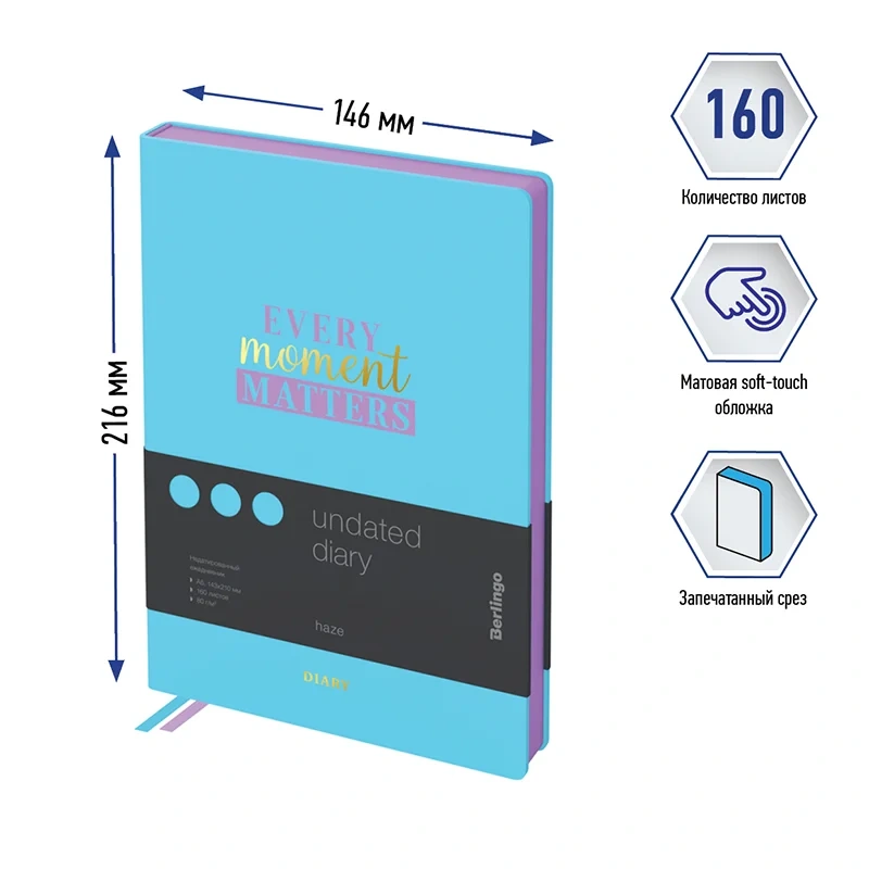 Стильный недатированный ежедневник Berlingo Spring формата B6 с ультрамягкой голубой обложкой из приятного на ощупь материала и фиксирующей резинкой подойдет для ярких заметок. Срез и форзацы ежедневника покрыты полноцветным рисунком. Внутренний блок состоит из 160 листов высококачественной кремовой бумаги повышенной плотности 80 г/м? с пантонной печатью в 2 краски. Недатированный ежедневник Berlingo Spring представлен в размере 122 на 183 мм.