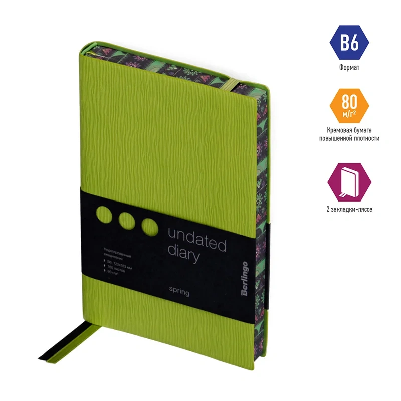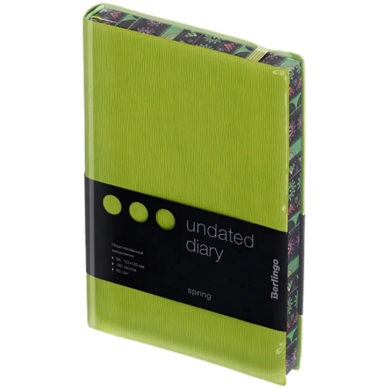 Стильный недатированный ежедневник Berlingo Spring формата B6 с ультрамягкой салатовой обложкой из приятного на ощупь материала и фиксирующей резинкой подойдет для ярких заметок. Срез и форзацы ежедневника покрыты полноцветным рисунком. Внутренний блок состоит из 160 листов высококачественной кремовой бумаги повышенной плотности 80 г/м? с пантонной печатью в 2 краски. Недатированный ежедневник Berlingo Spring представлен в размере 122 на 183 мм.