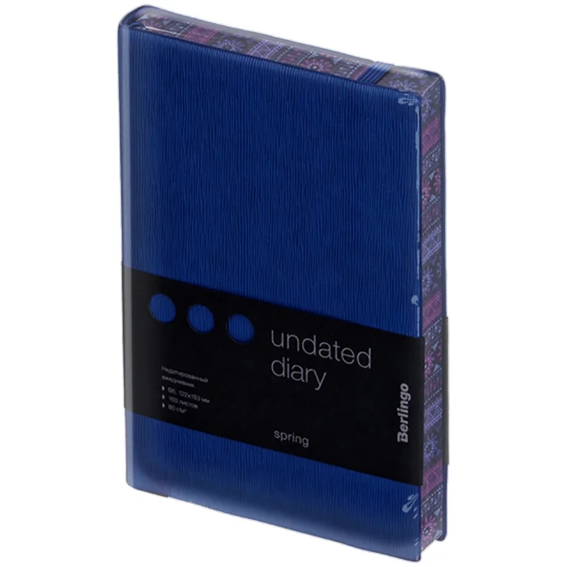 Стильный недатированный ежедневник Berlingo Spring формата B6 с ультрамягкой синей обложкой из приятного на ощупь материала и фиксирующей резинкой подойдет для ярких заметок. Срез и форзацы ежедневника покрыты полноцветным рисунком. Внутренний блок состоит из 160 листов высококачественной кремовой бумаги повышенной плотности 80 г/м? с пантонной печатью в 2 краски. Недатированный ежедневник Berlingo Spring представлен в размере 122 на 183 мм.