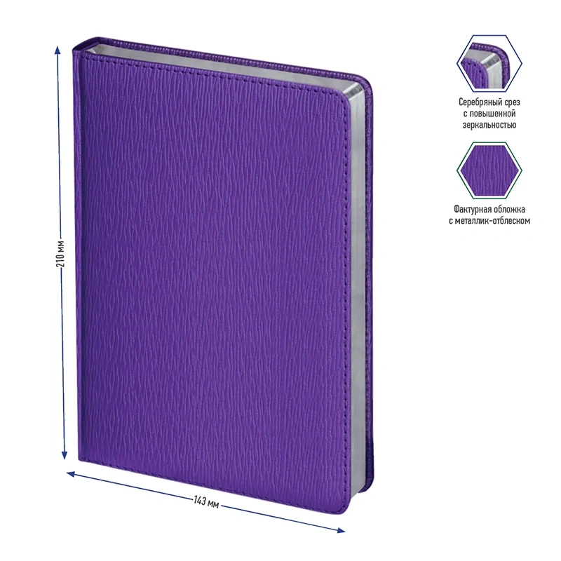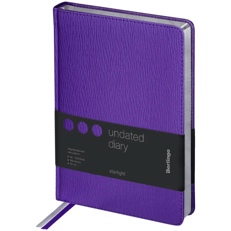 Оригинальный недатированный ежедневник Berlingo Starlight формата А5 с твердой блестящей обложкой из экокожи и поролоновой прослойкой идеально подойдет в качестве подарка. Серебряный фольгированный срез красиво подчеркивает яркий фиолетовый цвет обложки с продольной текстурой. Внутренний блок состоит из 160 листов высококачественной кремовой бумаги повышенной плотности 80 г/м? с пантонной печатью в 2 краски. Размер недатированного ежедневника – 150 на 215 мм.