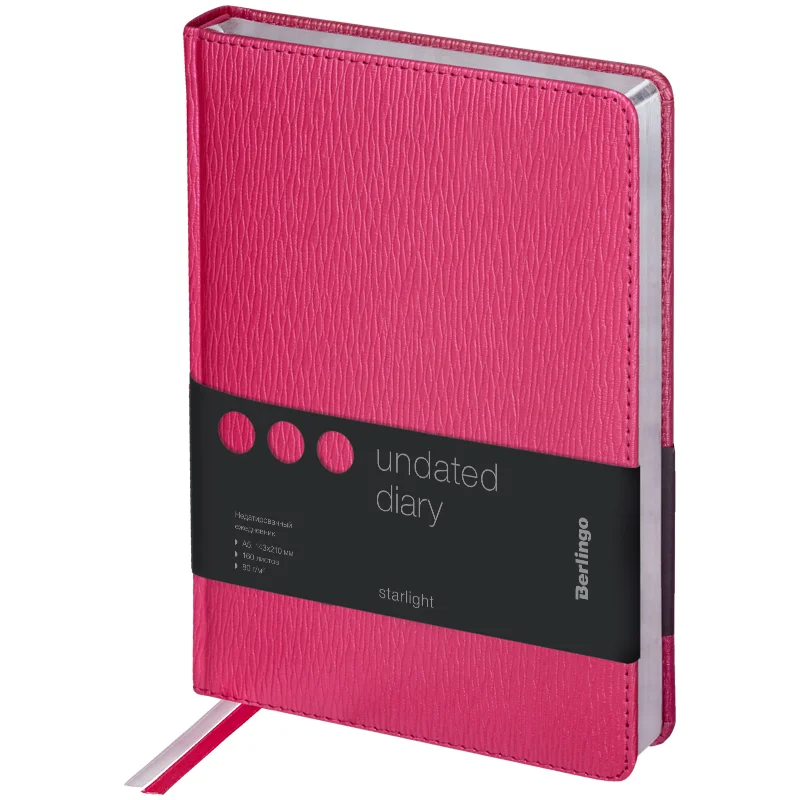 Оригинальный недатированный ежедневник Berlingo Starlight формата А5 с твердой блестящей обложкой из экокожи и поролоновой прослойкой идеально подойдет в качестве подарка. Серебряный фольгированный срез красиво подчеркивает яркую обложку цвета фуксии с продольной текстурой. Внутренний блок состоит из 160 листов высококачественной кремовой бумаги повышенной плотности 80 г/м? с пантонной печатью в 2 краски. Размер недатированного ежедневника – 150 на 215 мм.