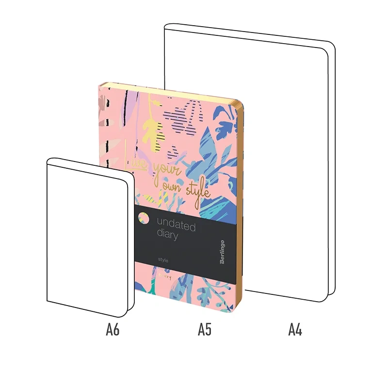 Недатированные ежедневники Berlingo 'Style' в мягкой обложке из искусственной кожи с ярким дизайном. Розовый цвет фона обложки. Фольгированные элементы дизайна на обложке. Золотой срез блока. Внутренний блок из 136 листов высококачественной кремовой бумаги повышенной плотности 80 г/м?, пантонная печать в 2 краски, справочный материал и перфорированные уголки. Две закладки-ляссе. Отрывные заметки, бланки извещения о ДТП и справочные материалы. 3 комплекта стикеров станут приятным подарком. Индивидуальная упаковка. Подходят под персонализацию