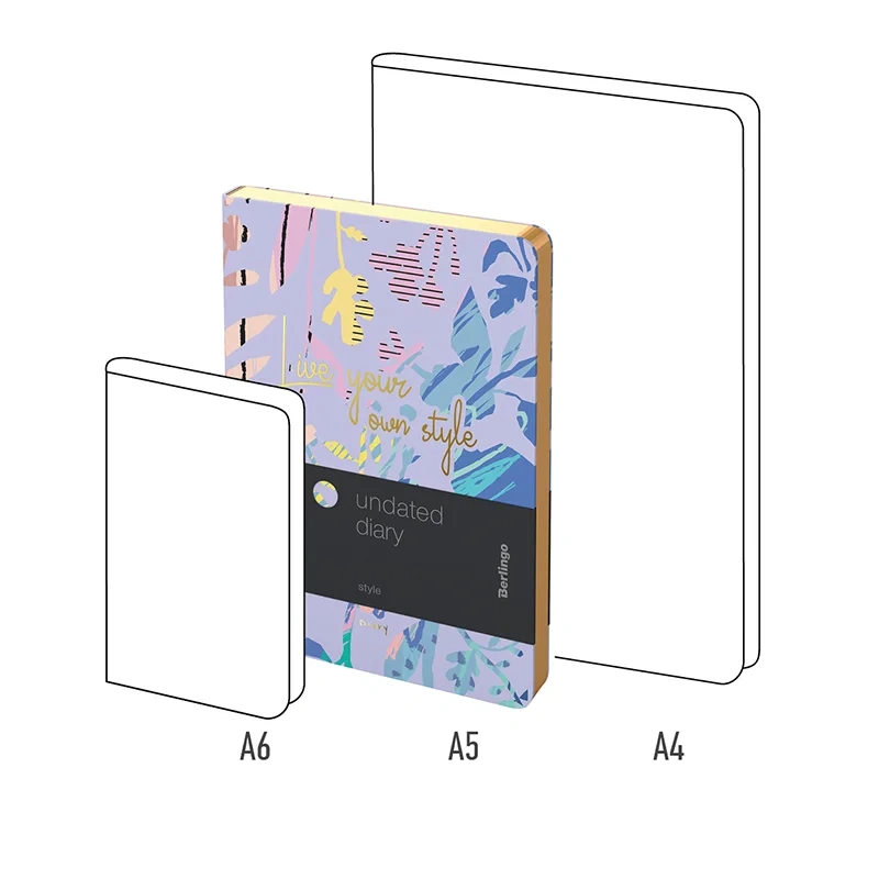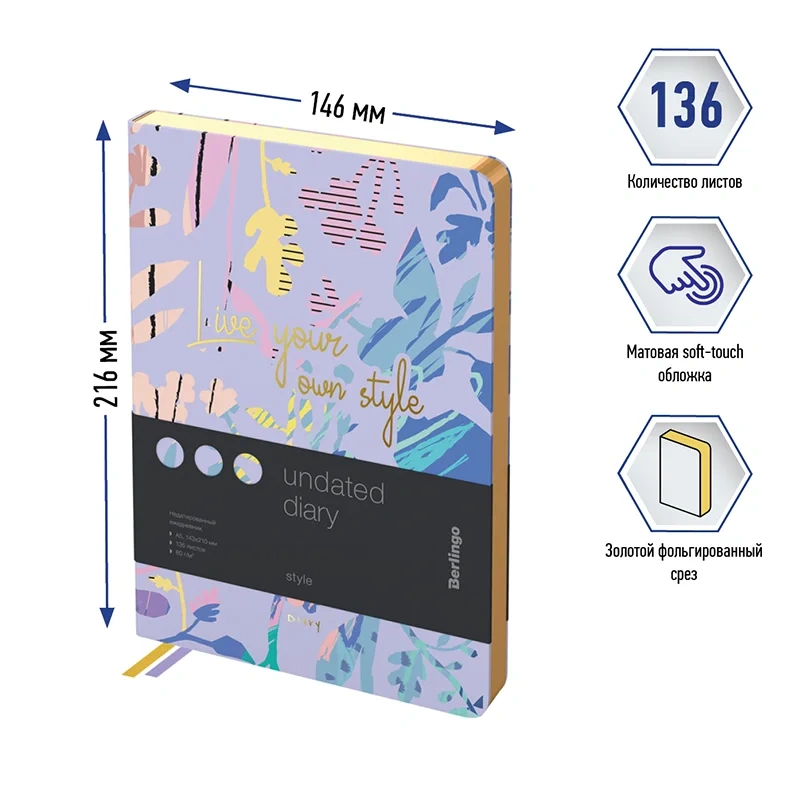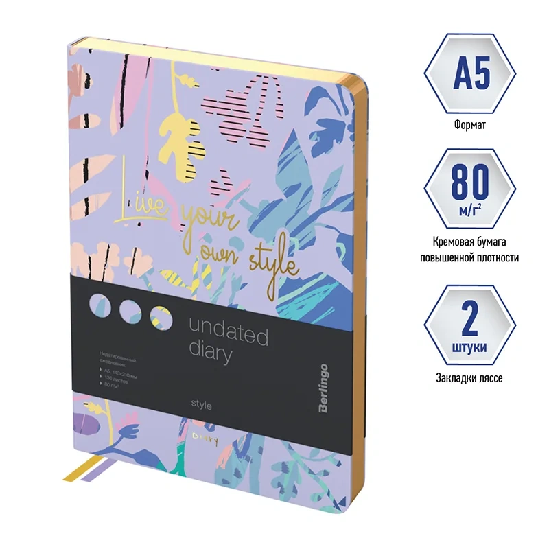Недатированные ежедневники Berlingo 'Style' в мягкой обложке из искусственной кожи с ярким дизайном. Фиолетовый цвет фона обложки. Фольгированные элементы дизайна на обложке. Золотой срез блока. Внутренний блок из 136 листов высококачественной кремовой бумаги повышенной плотности 80 г/м?, пантонная печать в 2 краски, справочный материал и перфорированные уголки. Две закладки-ляссе. Отрывные заметки, бланки извещения о ДТП и справочные материалы. 3 комплекта стикеров станут приятным подарком. Индивидуальная упаковка. Подходят под персонализацию