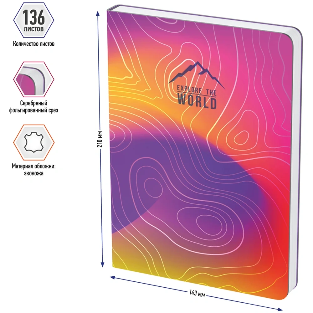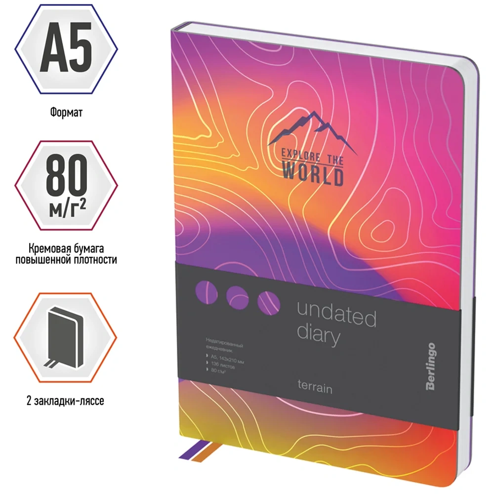 Стильный недатированный ежедневник Berlingo Terrain формата A5 с серебристым фольгированным срезом и ультрамягкой обложкой из высококачественной экокожи. Яркий дизайн коллекционной серии Berlingo Terrain. Внутренний блок состоит из 136 листов высококачественной кремовой бумаги повышенной плотности 80 г/м? с пантонной печатью в 2 краски. Представлен в размере 143 на 210 мм.