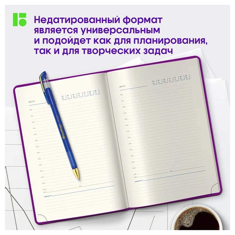 Перфорированные уголки, справочная информация и 2 закладки-ляссе сделают использование ежедневника Berlingo Vivella Prestige комфортным. Внутри располагаются географическая карта, отрывные заметки, бланки извещения о ДТП и справочные материалы. Недатированный ежедневник Berlingo подходит под персонализацию. 3 комплекта стикеров станут приятным подарком.