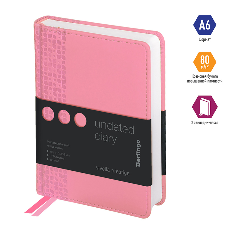 Ежедневники Berlingo Vivella Prestige изготовлены из высококачественного кожзаменителя с мягкой гладкой матовой поверхностью. Ежедневник недатированный формата А6 (115*160 мм) с обложкой с поролоновой прослойкой и прострочкой по периметру. Имиджевое тиснение на обложке. Цвет обложки - розовый. 160 листов. Высококачественная белая бумага повышенной плотности 80 г/м2, пантонная печать блока в 2 краски, справочный материал, географические карты на форзацах. Перфорированные уголки блока. 2 закладки-ляссе. Отрывные заметки. В подарок 3 комплекта стикеров.