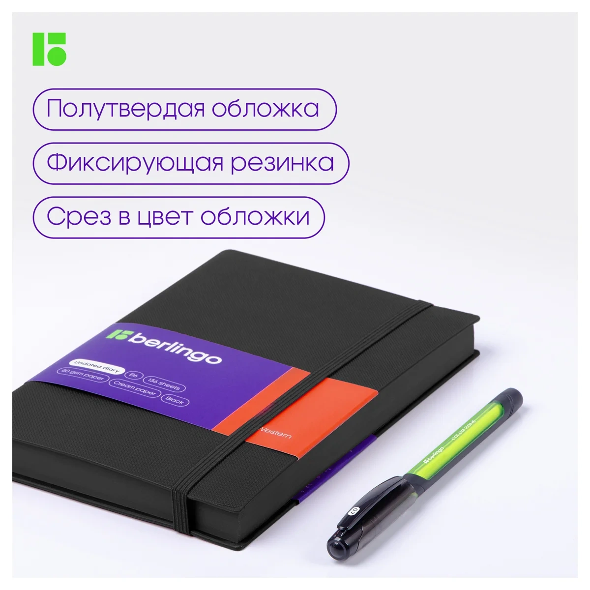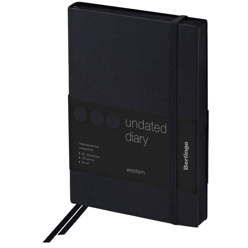 Недатированный ежедневник Berlingo Western формата B6 имеет мягкую обложку из высококачественной кожи чёрного цвета. Срез такого же цвета и внешняя резинка отлично дополняют общий дизайн. Благодаря этому изделие смотрится элегантно и стильно. Внутренний блок состоит из 136 листов высококачественной кремовой бумаги повышенной плотности 80 г/м? с пантонной печатью в 2 краски. Ежедневник Berlingo Western представлен в размере 122 на 183 мм.