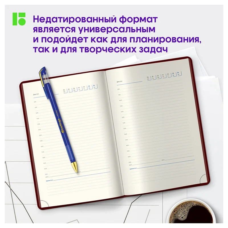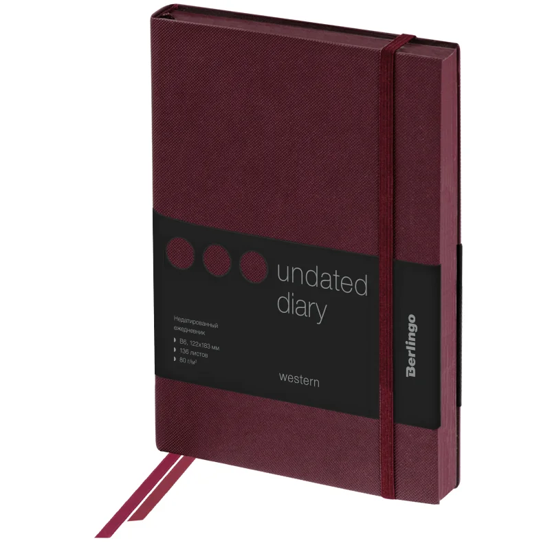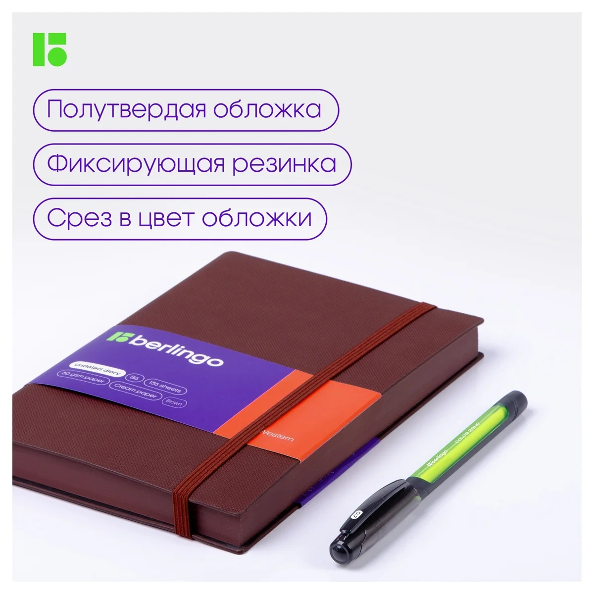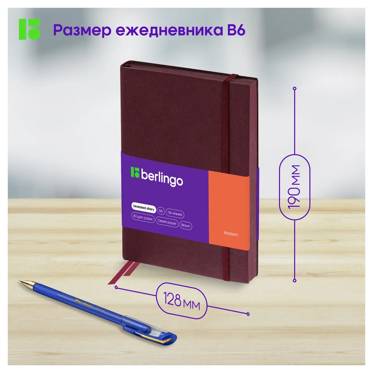 Компактный и стильный ежедневник Berlingo Western формата B6 с коричневой мягкой обложкой из высококачественной экокожи. Изделие надёжно закрывает внешняя резинка, которая отлично дополняет общий дизайн вместе с коричневым срезом. Внутренний блок состоит из 136 листов высококачественной кремовой бумаги повышенной плотности 80 г/м? с пантонной печатью в 2 краски. Недатированный ежедневник Berlingo Western представлен в размере 122 на 183 мм.