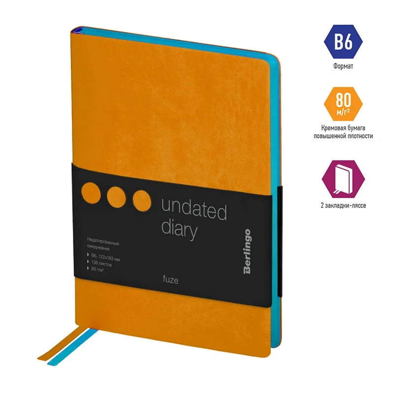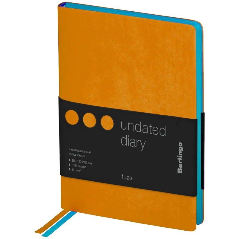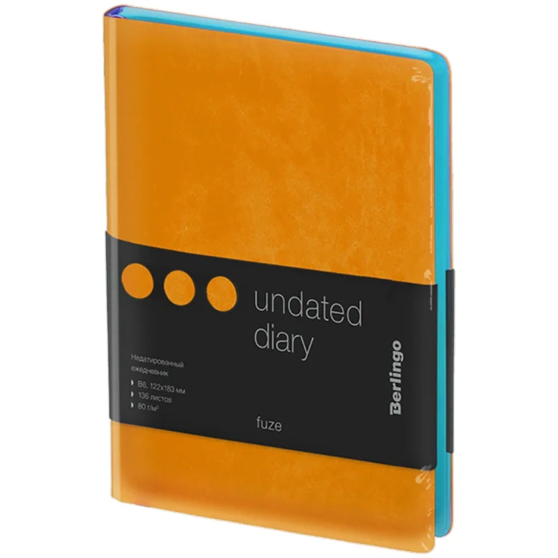 Яркий ежедневник Berlingo Fuze формата B6 имеет мягкую обложку из высококачественной кожи оранжевого цвета. Общий дизайн изделия дополняет яркий голубой срез, благодаря чему ежедневник смотрится необычно. Внутренний блок состоит из 136 листов высококачественной кремовой бумаги повышенной плотности 80 г/м? с пантонной печатью в 2 краски. Недатированный ежедневник Berlingo Fuze представлен в размере 122 на 183 мм.