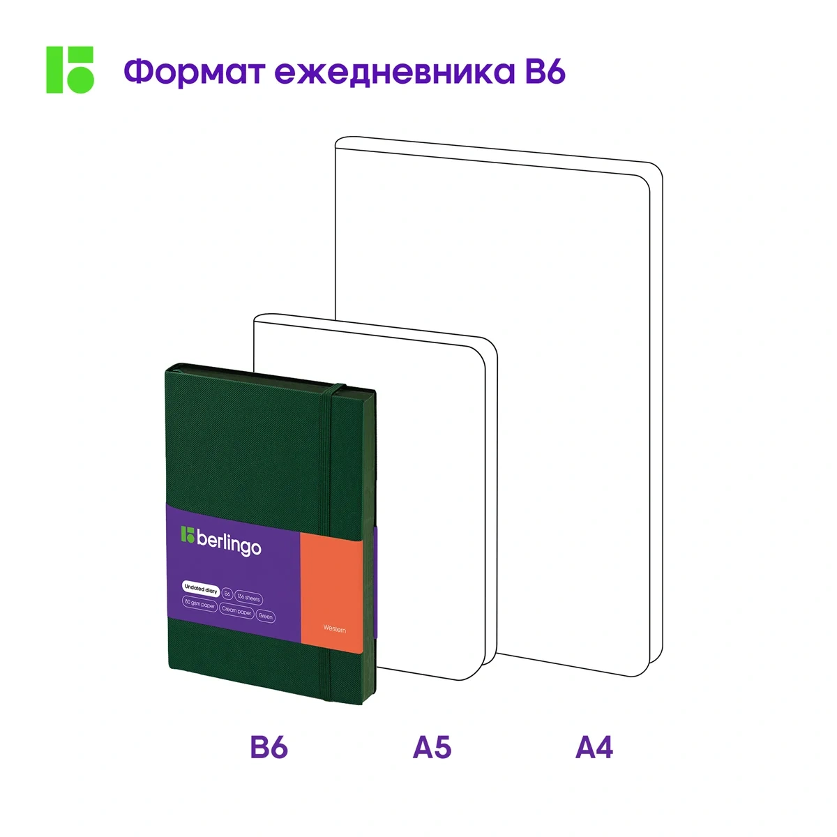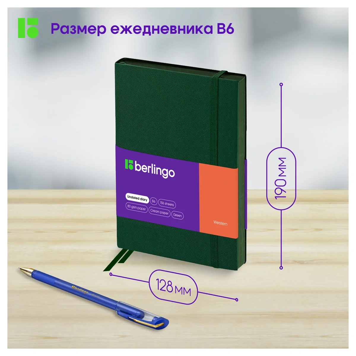 Компактный ежедневник Berlingo Western формата B6 в зелёной мягкой обложке из высококачественной экокожи. Изделие надёжно закрывает внешняя резинка, которая отлично дополняет общий дизайн вместе с зелёным срезом. Внутренний блок состоит из 136 листов высококачественной кремовой бумаги повышенной плотности 80 г/м? с пантонной печатью в 2 краски. Недатированный ежедневник Berlingo Western представлен в размере 122 на 183 мм.