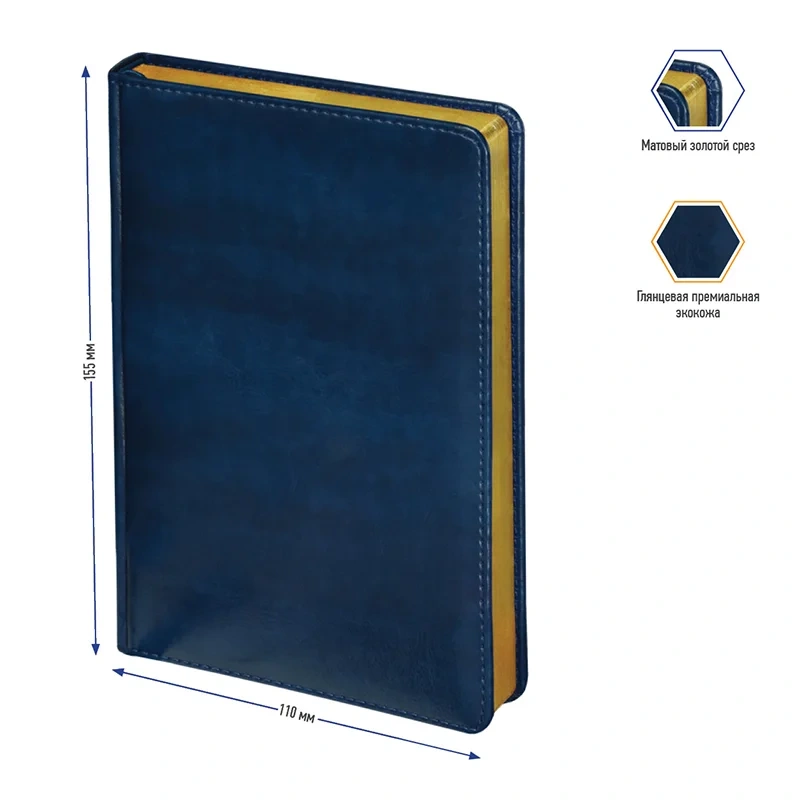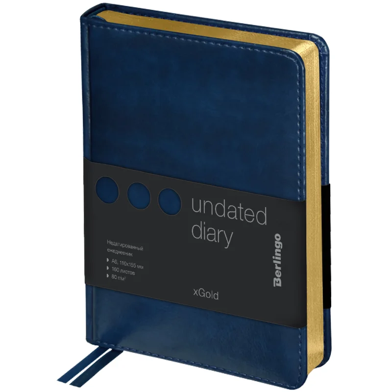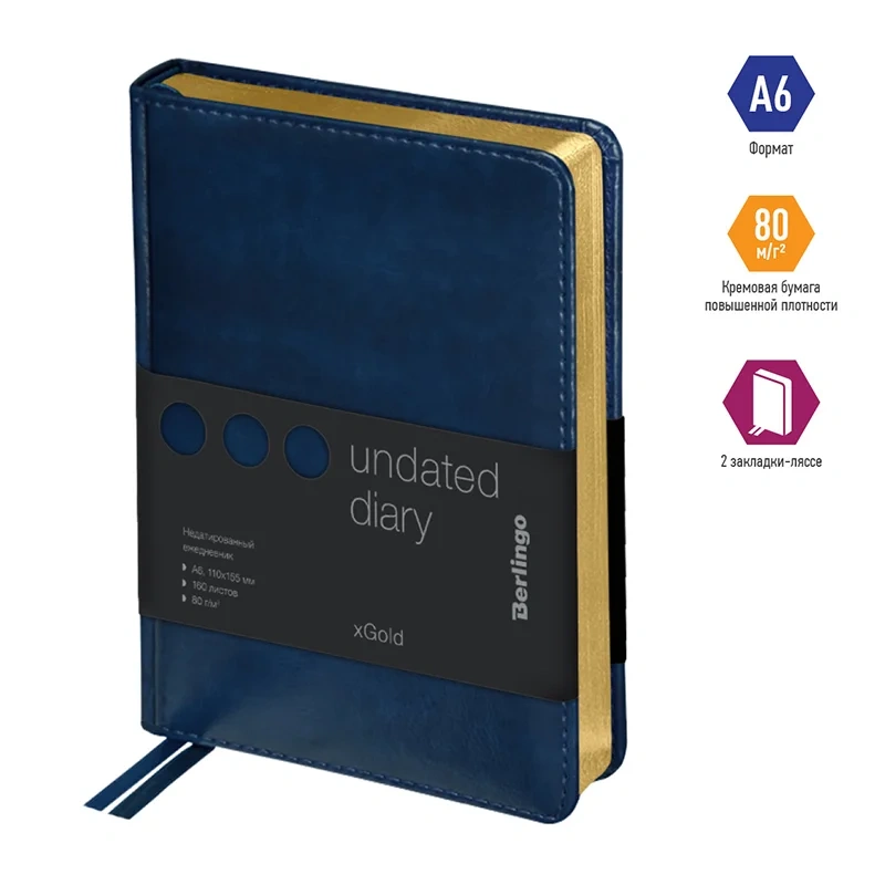 Компактный недатированный ежедневник Berlingo xGold формата А6 с твердой обложкой из экокожи и поролоновой прослойкой идеален для повседневного использования. Золотой фольгированный срез красиво подчеркивает глубокий синий цвет обложки. Внутренний блок состоит из 160 листов высококачественной кремовой бумаги повышенной плотности 80 г/м? с пантонной печатью в 2 краски. Размер недатированного ежедневника – 110 на 155 мм.