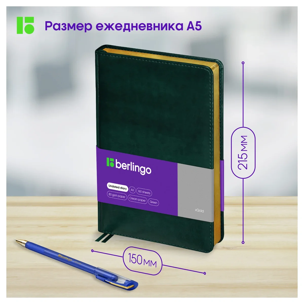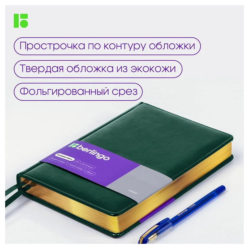Оригинальный недатированный ежедневник Berlingo xGold формата А5 с твердой обложкой из экокожи и поролоновой прослойкой понравится каждому. Золотой фольгированный срез красиво подчеркивает глубокий зеленый цвет обложки. Внутренний блок состоит из 160 листов высококачественной кремовой бумаги повышенной плотности 80 г/м? с пантонной печатью в 2 краски. Размер недатированного ежедневника – 150 на 215 мм.