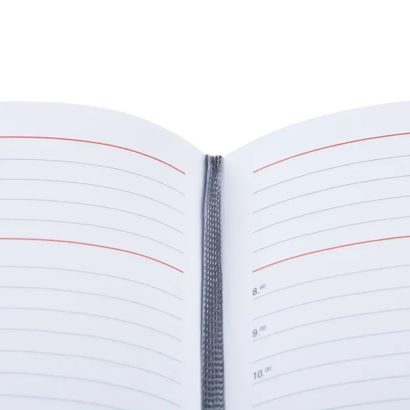 Внутренний блок состоит из 180 листов белой офсетной бумаги плотностью 80 г/кв.м с линейной разлиновкой в две краски. Листы скреплены сшивкой, что делает ежедневник прочным и долговечным. Для удобства поиска страниц предусмотрено ляссе и перфорированные уголки. Обрез блока — белый.