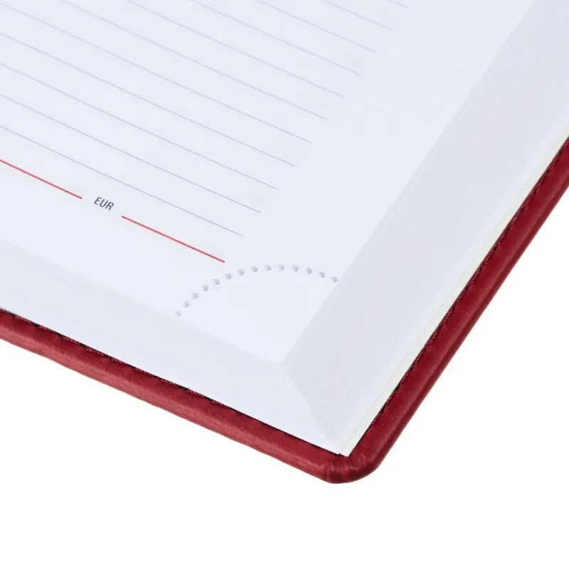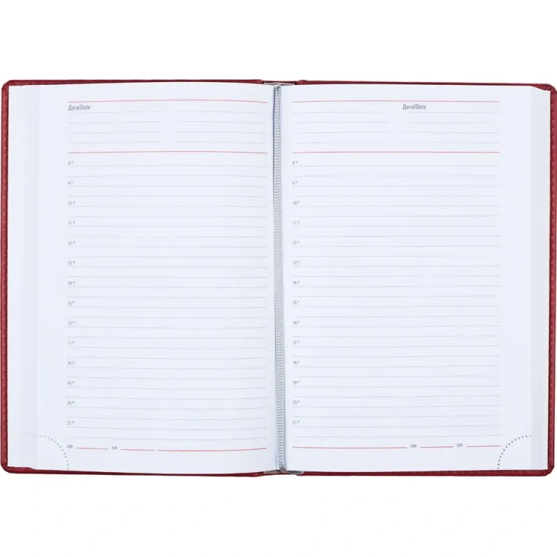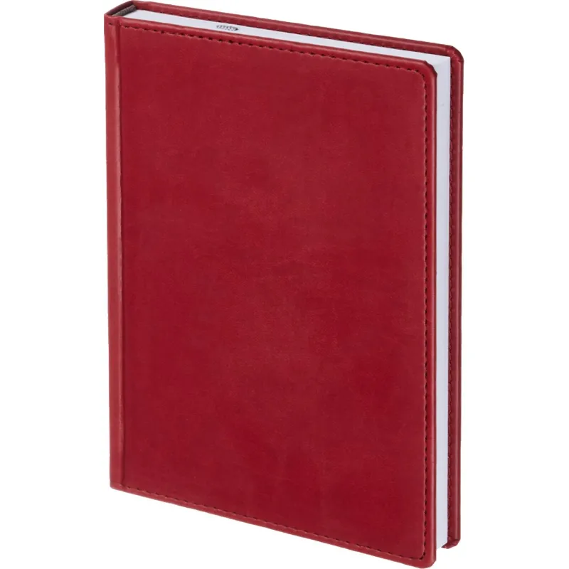Ежедневник (143×210 мм) выполнен в традиционном дизайне с однотонной обложкой бордового цвета. Твёрдая обложка изготовлена из искусственной кожи высокого качества, по периметру прошита строчкой. На ней можно нанести логотип любым способом тиснения — блинтом или фольгой.
