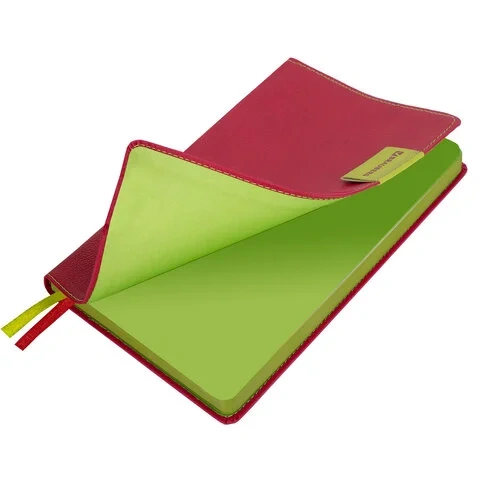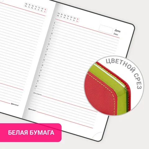 Внутренний блок включает 136 листов белой бумаги плотностью 70 г/м2. Благодаря стандартному формату А5 ежедневник удобно использовать как в офисе, так и на выездных деловых встречах. Интегральная обложка стилизована под гладкую кожу и прошита по периметру. Подходит для горячего тиснения. На внутренней стороне задней обложки есть декоративный конверт для разных мелочей в виде визиток, напоминалок или других милых и полезных мелочей. Срез и форзац ежедневника окрашены в контрастный цвет с обложкой, что придает ему особый шарм. Дополнением являются две закладки-ляссе, с помощью которых можно быстро открыть или зафиксировать ежедневник на нужной странице, а также держатель для ручки на контрасте с обложкой.