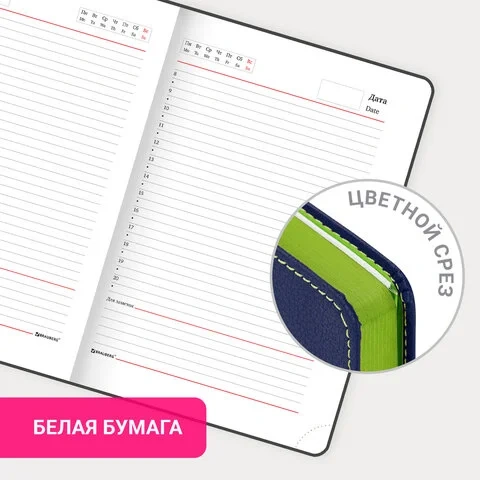 Срез и форзац ежедневника окрашены в контрастный цвет с обложкой, что придает ему особый шарм. Дополнением являются две закладки-ляссе, с помощью которых можно быстро открыть или зафиксировать ежедневник на нужной странице, а также держатель для ручки на контрасте с обложкой. Помимо прочего ежедневник снабжен справочным материалом. В конце ежедневника есть 3 страницы для записей и заметок.