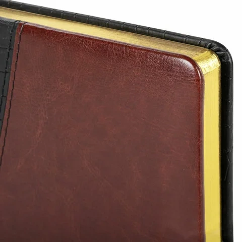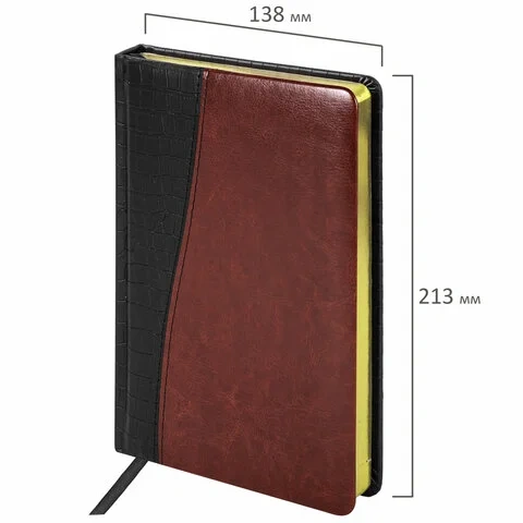 Внутренний блок включает 160 листов тонированной бумаги плотностью 70 г/м2. Каждая страничка имеет перфорированный угол. Благодаря стандартному формату А5 ежедневник удобно использовать как в офисе, так и на выездных деловых встречах. Твердая обложка состоит из двух материалов - под кожу крокодила и гладкую кожу. Подходит для горячего тиснения. Срез ежедневника фольгирован под 'золото', что придает ему особый шарм. Дополнением является закладка-ляссе, с помощью которой при необходимости можно быстро открыть ежедневник на нужной странице. Помимо прочего ежедневник снабжен обширным справочным материалом.