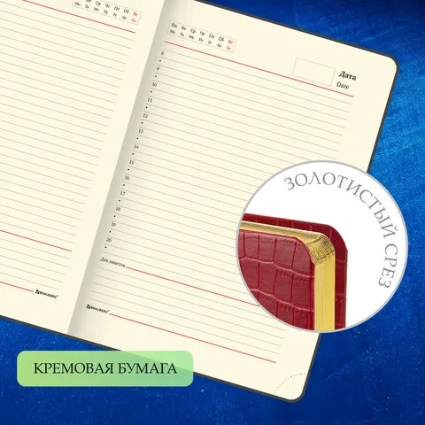 Внутренний блок включает 160 листов тонированной бумаги плотностью 70 г/м2. Каждая страничка имеет перфорированный угол. Благодаря стандартному формату А5 ежедневник удобно использовать как в офисе, так и на выездных деловых встречах. Твердая обложка стилизованная под кожу крокодила, подходит для горячего тиснения. Срез ежедневника фольгирован под 'золото', что придает ему особый шарм. Дополнением является закладка-ляссе, с помощью которой при необходимости можно быстро открыть ежедневник на нужной странице. Помимо прочего ежедневник снабжен обширным справочным материалом.