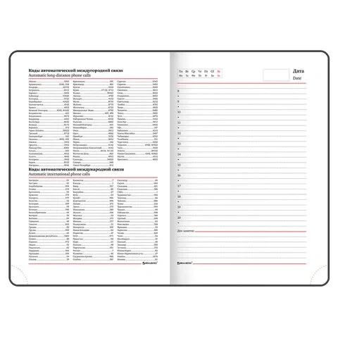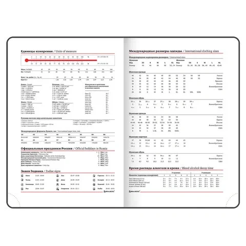 Внутренний блок включает 160 листов белой бумаги плотностью 70 г/м2. Каждая страничка имеет перфорированный угол. Благодаря стандартному формату А5 ежедневник удобно использовать как в офисе, так и на выездных деловых встречах. Твердая обложка стилизованная, под фактурную кожу, подходит для горячего тиснения. Дополнением является закладка-ляссе, с помощью которой при необходимости можно быстро открыть ежедневник на нужной странице. Помимо прочего ежедневник снабжен обширным справочным материалом.
