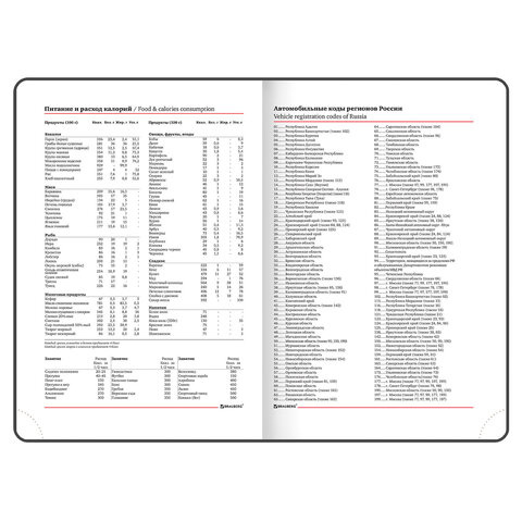 Внутренний блок включает 160 листов белой бумаги плотностью 70 г/м2. Каждая страничка имеет перфорированный угол. Благодаря стандартному формату А5 ежедневник удобно использовать как в офисе, так и на выездных деловых встречах. Твердая обложка, стилизованная под 'фактурную кожу', подходит для горячего тиснения. Дополнением является закладка-ляссе, с помощью которой при необходимости можно быстро открыть ежедневник на нужной странице. Помимо прочего ежедневник снабжен обширным справочным материалом.