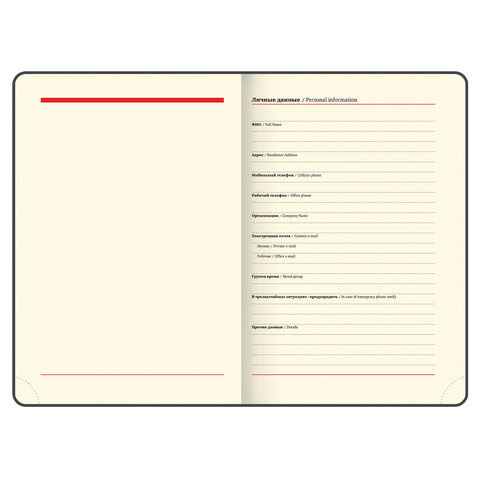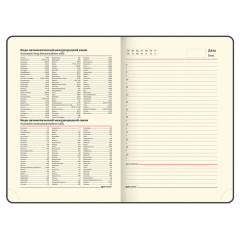 Внутренний блок включает 136 листов тонированной бумаги плотностью 70 г/м2. Каждая страничка имеет перфорированный угол. Благодаря стандартному формату А5 ежедневник удобно использовать как в офисе, так и на выездных деловых встречах. Интегральная обложка стилизована под гладкую кожу. Подходит для горячего тиснения. Срез и форзац ежедневника окрашены в контрастный цвет с обложкой, что придает ему особый шарм. Дополнением является закладка-ляссе, с помощью которой при необходимости можно быстро открыть ежедневник на нужной странице. Помимо прочего ежедневник снабжен обширным справочным материалом.