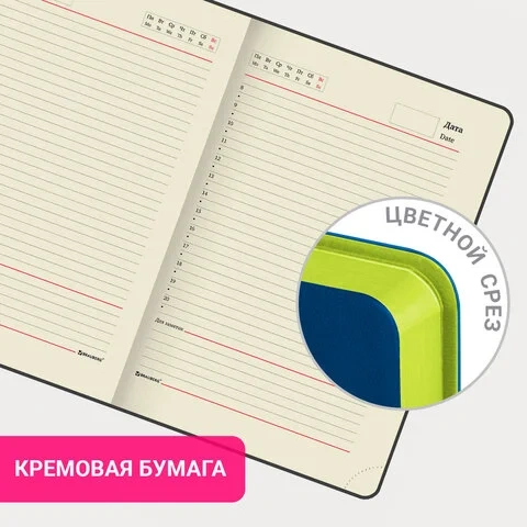 Внутренний блок включает 136 листов тонированной бумаги плотностью 70 г/м2. Каждая страничка имеет перфорированный угол. Благодаря стандартному формату А5 ежедневник удобно использовать как в офисе, так и на выездных деловых встречах. Интегральная обложка стилизована под гладкую кожу. Подходит для горячего тиснения. Срез и форзац ежедневника окрашены в контрастный цвет с обложкой, что придает ему особый шарм. Дополнением является закладка-ляссе, с помощью которой при необходимости можно быстро открыть ежедневник на нужной странице. Помимо прочего ежедневник снабжен обширным справочным материалом.