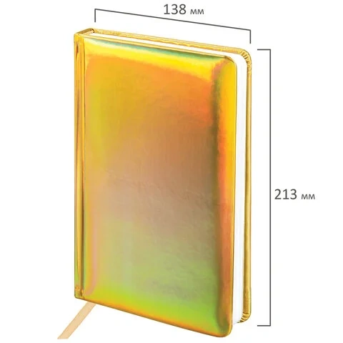 Внутренний блок включает 136 листов белой бумаги плотностью 70 г/м2. Каждая страничка имеет перфорированный угол. Благодаря стандартному формату А5 (138х213 мм) ежедневник удобно использовать как в офисе, так и на выездных деловых встречах. Твердая обложка стилизована под зеркальную кожу золотистого цвета. Подходит для горячего тиснения. Дополнением является закладка-ляссе, с помощью которой при необходимости можно быстро открыть ежедневник на нужной странице. Помимо прочего ежедневник снабжен справочным материалом.