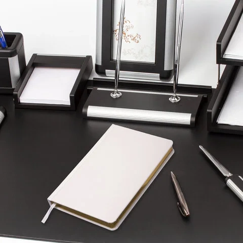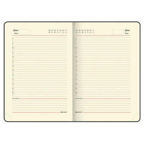 Внутренний блок включает 160 листов тонированной бумаги плотностью 70 г/м2. Каждая страничка имеет перфорированный угол. Благодаря стандартному формату А5 (138х213 мм) ежедневник удобно использовать как в офисе, так и на выездных деловых встречах.
