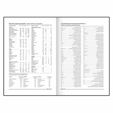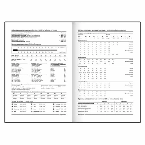 Внутренний блок содержит 160 листов офсетной бумаги плотностью 60 г/м2. Обложка из бумвинила и твердый переплет обеспечивают долгий срок службы. Помимо прочего ежедневник содержит коды городов и телефонную книгу.