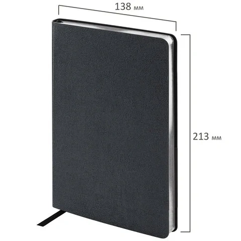 Внутренний блок включает 136 листов белой бумаги плотностью 70 г/м2. Каждая страничка имеет перфорированный угол. Благодаря стандартному формату А5 (138х213 мм) ежедневник удобно использовать как в офисе, так и на выездных деловых встречах. Мягкая (интегральная) обложка стилизована под фактурную кожу с глянцевым отливом. Подходит для горячего тиснения.