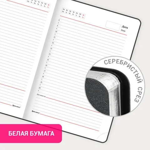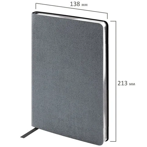 Внутренний блок включает 136 листов белой бумаги плотностью 70 г/м2. Каждая страничка имеет перфорированный угол. Благодаря стандартному формату А5 (138х213 мм) ежедневник удобно использовать как в офисе, так и на выездных деловых встречах. Мягкая (интегральная) обложка стилизована под фактурную кожу с глянцевым отливом. Подходит для горячего тиснения.