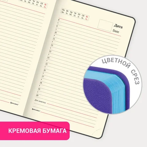 Срез и форзац ежедневника окрашены в контрастный цвет с обложкой, что придает ему особый шарм. Дополнением является закладка-ляссе, с помощью которой при необходимости можно быстро открыть ежедневник на нужной странице. Помимо прочего ежедневник снабжен обширным справочным материалом. В конце ежедневника есть 3 страницы для записей и заметок.