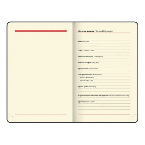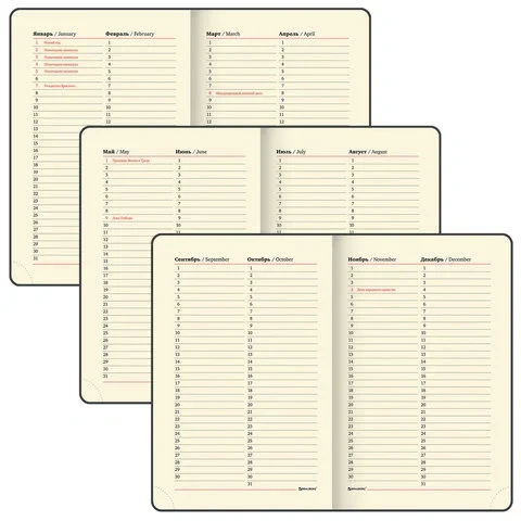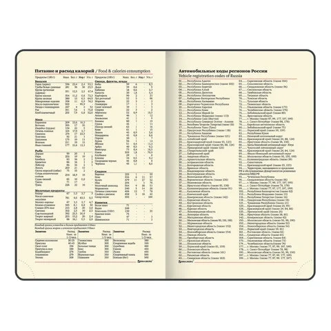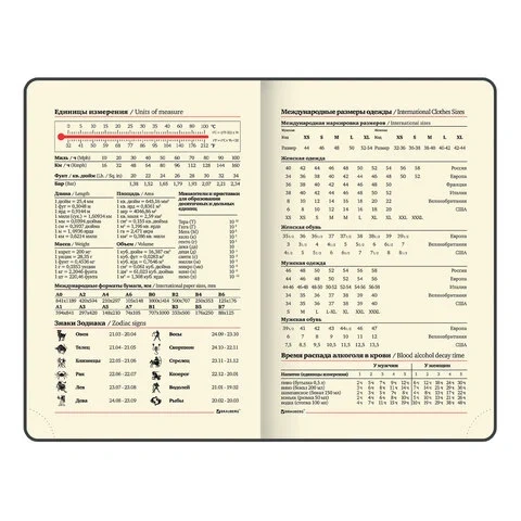 Снабжен резинкой-фиксатором, благодаря чему ежедневник не откроется в сумочке или портфеле и листы не помнутся. В комплект входит закладка-ляссе, с помощью которой можно быстро открыть ежедневник на нужной странице. Также в ежедневнике есть справочный материал и 7 страниц для записей и заметок в конце.