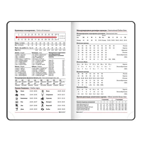 Внутренний блок включает 136 листов белой бумаги плотностью 70 г/м2. Каждая страничка имеет перфорированный угол. Благодаря малому формату А6 (100х150 мм) ежедневник удобно использовать как в офисе, так и на выездных деловых встречах. Жесткая книжная обложка с легкой рельефной фактурой напоминает натуральную кожу. Материал обложки, балакрон, подходит для тиснения только фольгой. Дополнением является закладка-ляссе, с помощью которой при необходимости можно быстро открыть ежедневник на нужной странице. Помимо прочего ежедневник снабжен обширным справочным материалом.