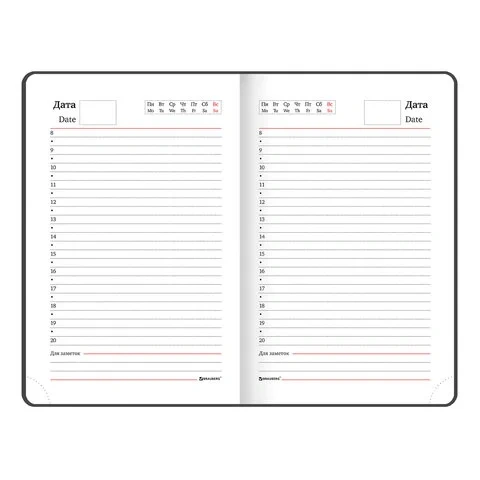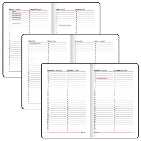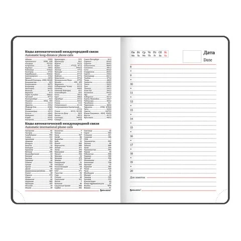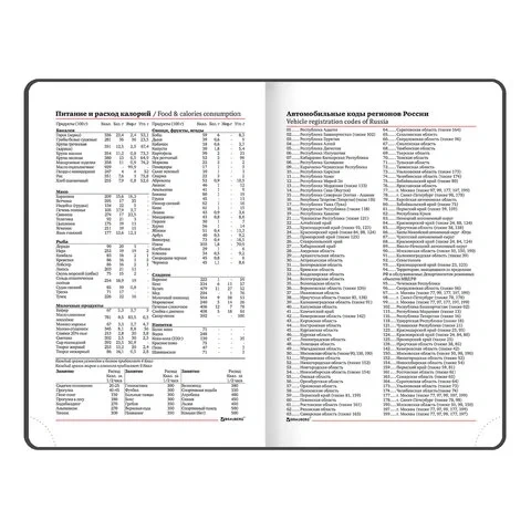 Внутренний блок включает 136 листов белой бумаги плотностью 70 г/м2. Каждая страничка имеет перфорированный угол. Благодаря малому формату А6 (100х150 мм) ежедневник удобно использовать как в офисе, так и на выездных деловых встречах. Жесткая книжная обложка с легкой рельефной фактурой напоминает натуральную кожу. Материал обложки, балакрон, подходит для тиснения только фольгой. Дополнением является закладка-ляссе, с помощью которой при необходимости можно быстро открыть ежедневник на нужной странице. Помимо прочего ежедневник снабжен обширным справочным материалом.