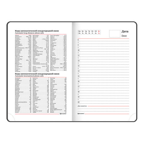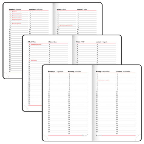 Внутренний блок включает 136 листов белой бумаги плотностью 70 г/м2. Каждая страничка имеет перфорированный угол. Благодаря малому формату А6 (100х150 мм) ежедневник удобно использовать как в офисе, так и на выездных деловых встречах. Твердая обложка стилизована под гладкую кожу. Подходит для горячего тиснения. Срез и форзац ежедневника окрашены на контрасте с цветом обложки, что придает ему особый шарм. Дополнением является закладка-ляссе, с помощью которой при необходимости можно быстро открыть ежедневник на нужной странице. Помимо прочего ежедневник снабжен обширным справочным материалом.