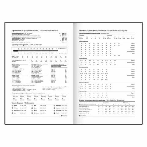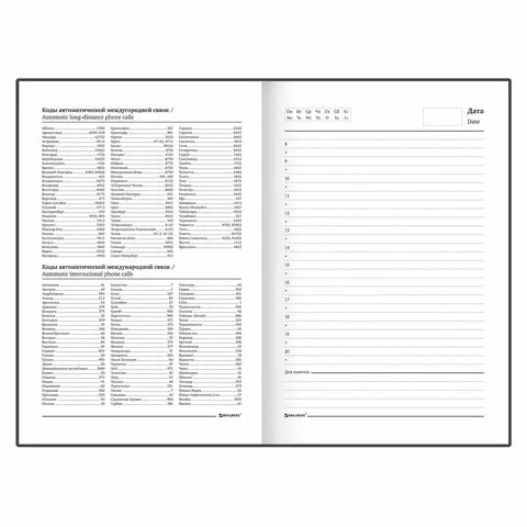 Внутренний блок содержит 160 листов офсетной бумаги плотностью 60 г/м2. Обложка из бумвинила и твердый переплет обеспечивают долгий срок службы. Помимо прочего ежедневник содержит коды городов и телефонную книгу.