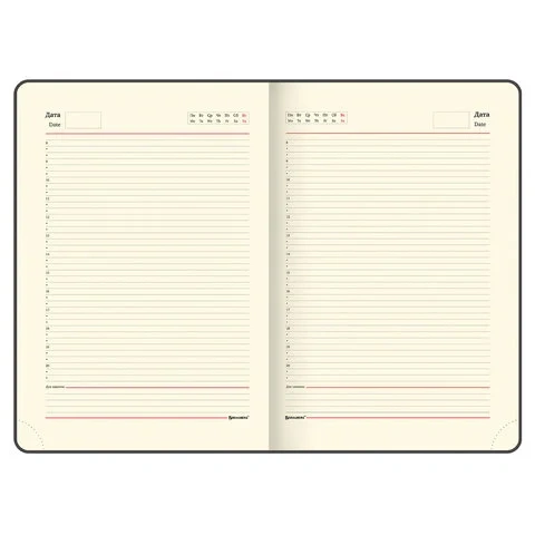 Внутренний блок включает 160 листов тонированной бумаги плотностью 70 г/м2. Каждая страничка имеет перфорированный угол. Благодаря стандартному формату А4 (210х297 мм) ежедневник удобно использовать как в офисе, так и на выездных деловых встречах. Твердая обложка стилизована под фактурную кожу. Подходит для горячего тиснения.